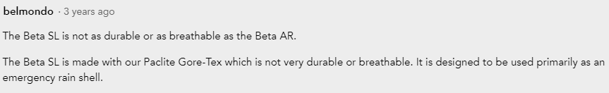 I’m extra salty about that jacket for 2 other reasons. First, the high wear areas should really include your back. You get a ton of pack friction that will rub through that spray on interior protection and expose the membrane, but Arc’teryx doesn’t extend the 3 layer coverage on your back under the notion that your back doesn’t really get wet when you’re wearing a pack. However, sometimes you take it off, like at snack breaks or at camp. Or, you spent $400 on a fucking jacket and rightfully expect to be able to wear it as your around-town rain layer too. Second, the Beta is their versatile, multi-sport jacket design. They gave it harness-compatible pockets, a helmet compatible hood, yet in the Customer Q&A, customer service says it’s unfit for mountaineering. So seriously, what’s the point? (I mean, other than maximizing profit out of a customer trying to save a few bucks). And they even have the audacity say that the Beta SL is really only durable enough for emergencies. I don’t know who needs to hear this, emergency ponchos are made of Mylar or plastic and cost under $25.