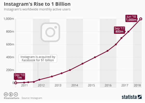 Before we can dig in, it’s important to review Instagram’s timeline. The app launched in 2010 and sold to Facebook and expanded to Android phones in 2012. The word “latergram” became a part of basic vocabulary in late 2013, and Instagram user counts have only grown consistently, with the fastest acceleration in the back half of the 2010s.