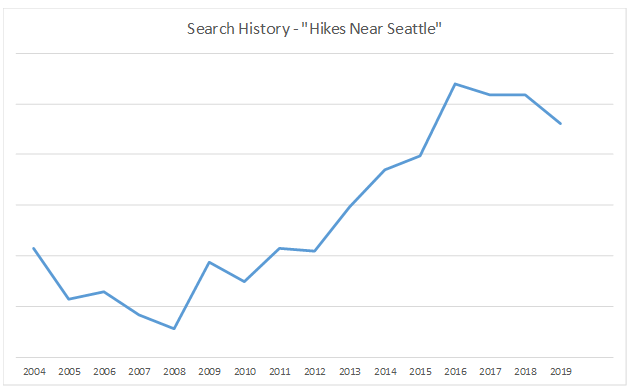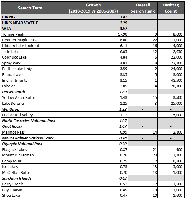 Quick summary of what you’re seeing here: Hiking related searches in WA are up 42%, “hikes near Seattle” is up 129%, and searches for WTA are up 257% compared to ~15 years ago. Tolmie Peak has seen the most drastic increase in search traffic, with almost 18 times the number of searches. Searches for Shoe Lake and Royal Basin have fallen by over half. The Enchantments, Rattlesnake Ledge/Ridge, and Lake Serene are the most frequently searched hikes. Heather Maple Pass and Flapjack Lakes are the least frequently searched.