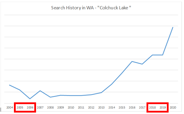 There are some interesting trends, namely that travel and exploration are moving north and east. Winthrop, Leavenworth, and the North Cascades National Park have all seen increased traffic, and the “viral” hikes that saw the biggest jumps in search tend to be in those directions. There’s definitely a chicken-and-egg question of whether trail traffic is a side effect of a tourism increase, or if the trails are the ones diving the growth. Meanwhile, the Olympics are getting less popular. Could it be a Twilight effect? Timing checks out.