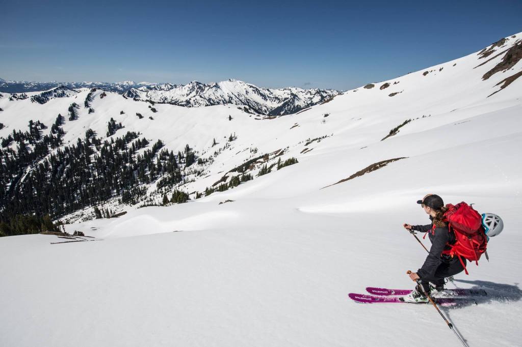 Know how to find good snow. There are 2 types of forgiving, easy-to-steer-in snow. The first is cold & fresh. The second is frozen and thawed a dozen times over. Here in the Cascades, fresh snow means a higher avalanche risk. As it settles over a few days, it tends gets warm (over 28 degrees or so) at some point, where it starts to clump into feta cheese-like chunks. But occasionally, we get an extra cold storm and chilly temps that stick around for a few days and the snow stays nice and light as it bonds to lower layers. This is what dreams are made of. On the other end of the spectrum, in spring, temps swing dramatically between day and night, where slopes get super icy overnight and then the top layer thaws out with the mid-morning sun. This is “corn” snow and it’s like Mother Nature’s groomer since there’s a small soft layer on top, but a frozen, supportive base underneath. Spring is also prime time for new tourers since avalanche risk tends to be lower, temps are warmer, and days are longer.