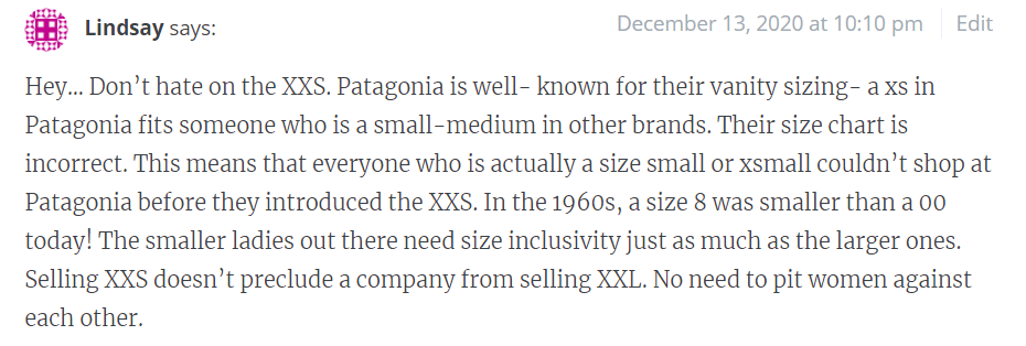 A little over a year ago, I wrote this piece in response to Patagonia’s blog on why they don’t carry plus sizes. They took their piece down a few months after mine was published, but it’s still available thanks to web archiving, here. In short, a lot of their logic didn’t check out with how clothing was designed, committed to, and manufactured. You’d think the decision to pull the page down would almost serve as an acknowledgment that it didn’t cast them in the best light.