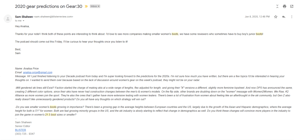 Small women do need advocacy, but not from Patagonia. The bigger need is in technical footwear like mountaineering boots and ski boots. For mountaineering and ski touring boots, smaller kids options don’t exist. And in alpine boots, kids options are made extremely short in the cuff since feet grow on kids before they grow in height, so manufacturers are optimizing kids boots for girls around 9-10 years old and younger, who stand at a max of just over 4 feet. The average woman who stops growing at a size 5 or 6 shoe size is about a foot taller and needs some extra height in the cuff to fit her properly. I’ve been a vocal advocate for small women’s needs related to footwear for over a year. Here’s some receipts from the beginning of 2020.