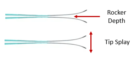 So what do I mean by shape? Every ski has “rocker” or that little flip up at the front of the ski. But some have more rocker than others. Rocker has 2 dimensions, tip splay (how far apart the ends of the tips are when you sandwich your skis together) and rocker depth (how far down the ski do the tips finally touch when sandwiched). Here’s all that in a picture: