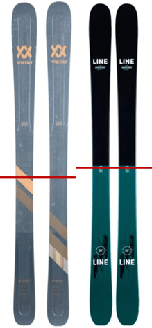 –Length and width: There are two general rules of thumb: For length, longer skis are harder to steer, but more stable than short skis. For width, narrower skis perform better on piste and wider skis are meant for powder. But these two rules are not absolute. Based on some of the other traits below, a 90mm ski might outperform a 100mm ski off-piste. Likewise, two different models of skis in the same length may not feel equally long while skiing.