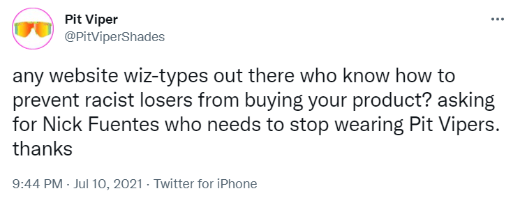 It takes a talented marketing and communications professional to tow the line between irreverence and offensiveness. It takes a deep understanding of diverse viewpoints, systems of oppression, and historical factors that lead to modern day pain for marginalized communities. I don’t get the sense that there are the people on the Pit Viper team who are able “thread the needle” so precisely, so I think they’ll continue to struggle with their public image and accidental ties to toxic masculinity.