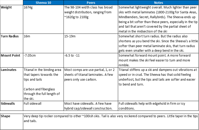 The Sheeva 10 and Rustler 10 are different skis. The Rustler’s DNA is largely the same, but it got beefed up after receiving lukewarm reviews its first season. The 172 Rustler 10 weighs 1880g compared to 1674g for the 172 Sheeva. That puts it more in line with the Santa Ana 98 and 104 FR, Rossignol Rallybirds, and Fischer Ranger 102 FR. The Rustler 10’ll offer more stability at speed and in crud and an inclination to slightly longer turns.