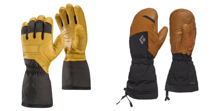 Below are the 2 gloves I picked out for my partner’s mitt quiver this season. The left is a 170gsm Black Diamond Guide Glove and the right is a 300gsm Mercury Mitt. Both are a mix of leather and nylon and use Primaloft Gold insulation.
