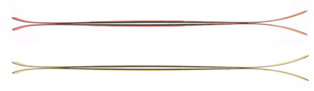 Same goes for skis. If I’m going to ski a ski with little rocker, the effective edge makes up almost the entire ski and I should choose a shorter size. If I ski a ski with a lot of rocker, I need to pick a longer size to get more effective edge. Here’s a look at two skis from K2. On the left, there’s the K2 Disruption MTi Alliance, which is the one of the stiffest, most aggressive piste skis they make, with rec-league racing or ex-racers in mind. On the right, there’s the Mindbender 115C Alliance, a ski largely made for powder skiing. As you can see, the difference in effective edge is stark:
