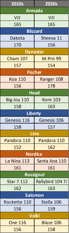 On one hand, I get that they’re slow-moving sizes. But on the other, brands can’t just settle for “riders must be 5’3” to ski powder.” Below is a comparison between the shortest / widest ski offered by brands in the 2010s on the left vs. the 2020s on the right. Petite women’s options are getting longer or narrower, if not both. And in case you forgot, Asian and Hispanic women both average 5’1” in height, meaning women skiers of color in particular have fewer tools available to them.