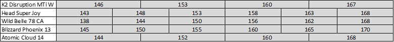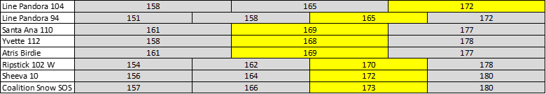 Most of my preferences are in the middle, or the 3rd of 4 sizes. So that should help inform where I fall in a groomer ski. Here are some options on the market and their sizing: