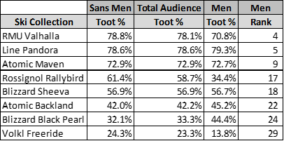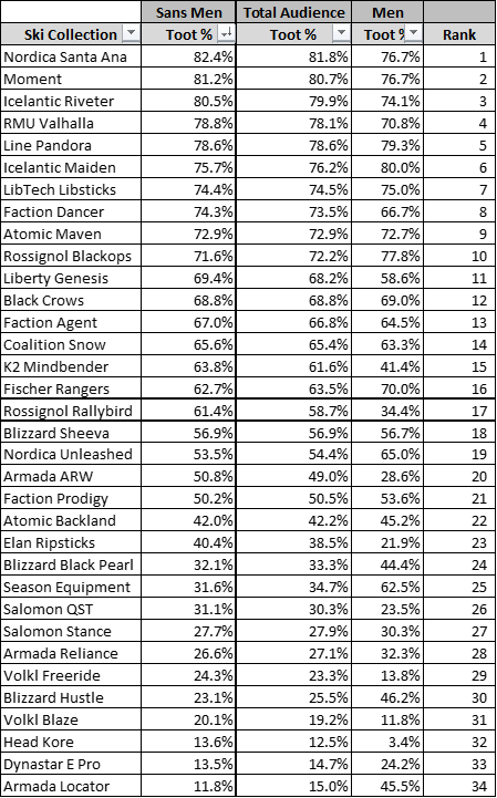 Skis were presented by line (or all women’s skis for brands with smaller lines). Then I separated out men’s votes. They tend to agree on skis they really like, but they had very different opinions on the least-liked side of the scale and swayed the results in the data. Coding responses from men was less than scientific. Some had pronouns in their bio. I know some of them personally. But a lot of it was assumptions that bearded folks named Zach or Brian with no pronouns or flags in their bios were generally fine with being perceived as men.
