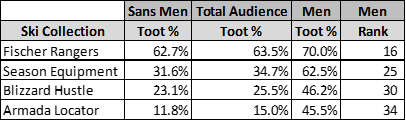 Armada’s Locator series came in dead last with an 11.8% approval rate after men’s votes were factored out. They’re a little plain for North American tastes. The art renderings strip out the little contrast and visual interest that they do have. But I think the biggest issue for women is the color choice. In boots and skis, the primary, “Crayola” colors have traditionally been used for men’s product. Women’s products use more jewel tones, pastels, and (when trendy) neons. Armada made a unisex ski line, but inadvertently pushed it to men by aligning with decades of color coding. In 2024, they’re adding a pastel topsheet alternative to the 88, 96, and 104. In one-on-one consultations, women have had very little interests in the Locator and I wonder if a graphic change is enough to convince them that Armada had skiers like them in mind during the R&D process for the ski.