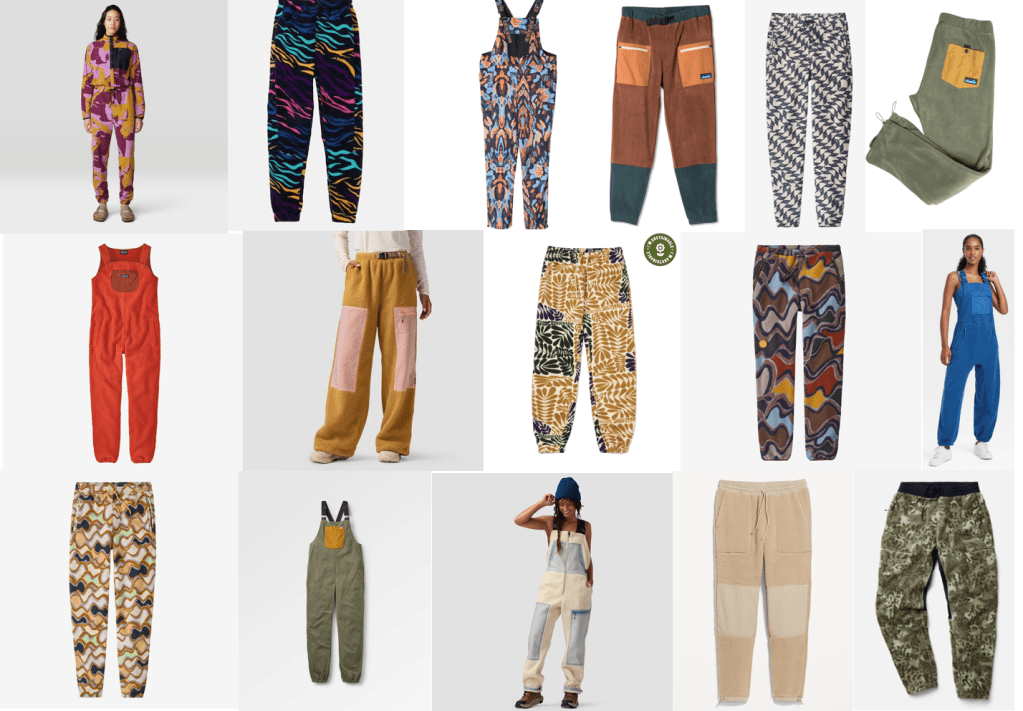 - Fleece pants are also an option (especially for men, who aren’t offered many overalls). To really be on trend, they’ve either got a novelty pattern or reinforced woven knee patches (or both). The Kavu Tamworth (women) and Teannastay (men) would be my top rec since they have zipper pockets and a lot of men want a back pocket for their wallets. The men’s Patagonia Synchilla also checks those boxes (women’s Micro D also cuts costs by nixing the zippers). Backcountry’s Wander line has cool woven reinforcement patches, while Old Navy offers a lower cost version. And the best prints come from Parks Project, Mountain Hardwear, and the Burton Cinder.