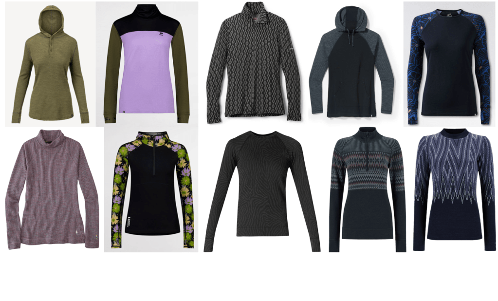 For women (left to right / top row first): 1 – Duckworth Polaris, 2 – Mons Royale Yotei High Neck, 3 – Icebreaker Vertex, 4 – Smartwool Hoodie, 5 – Wild Rye Evie Raglan Lite, 6 – Smartwool Thermal Turtleneck, 7 – Mons Royale Bella, 8 – Sweaty Betty Zebra Jacquard Crew, 9 – Kari Traa Silja Half Zip, 10 – Kari Traa Juliane Crew.