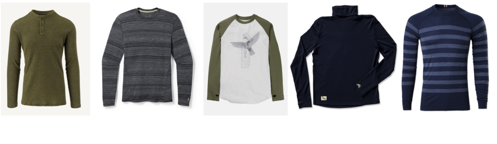 For men (left to right): 1- Duckworth Polaris, 2 – Smartwool Classic Thermal Crew, 3 – Burton Roadie Tech Tee, 4 – Tracksmith Fells Turtleneck, 5 – Tracksmith Brighton.