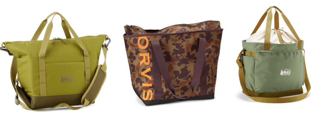 A Tote: A big tote (30-40L) is a workhorse piece of gear. They can serve as a weekender bag, a vessel for your camp kitchen or camp pantry. I’m partial to the 40L Orvis Adventure Tote since it’s a sharp price point and zips closed. But I also like the square design and cinch-top of the REI Trailgate 45. And the REI Pack-Away 12 is a nice option for an insulated tote for cold bevies.