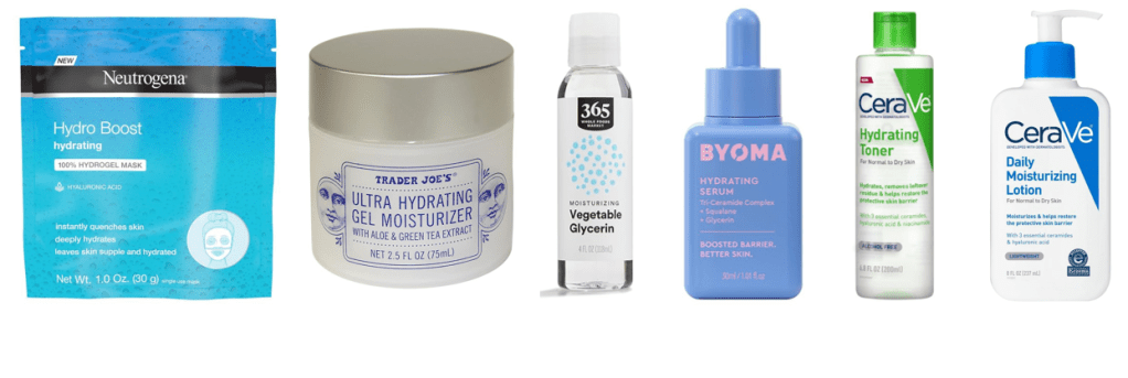 Use humectants after a gentle cleanser. Humectants deliver water into our skin cells. Humectants are a key ingredient in a number of products: moisturizers, serums, masks, oils, toners. Look for ingredients like glycerin, jojoba oil, urea, hyaluronic acid, and AHAs. I love a Neutrogena Hydro Boost sheet mask after a day outdoors, but settle for a few drops of jojoba oil or a layer of Trader Joe’s Hydrating Gel Moisturizer when I don’t have the time.
