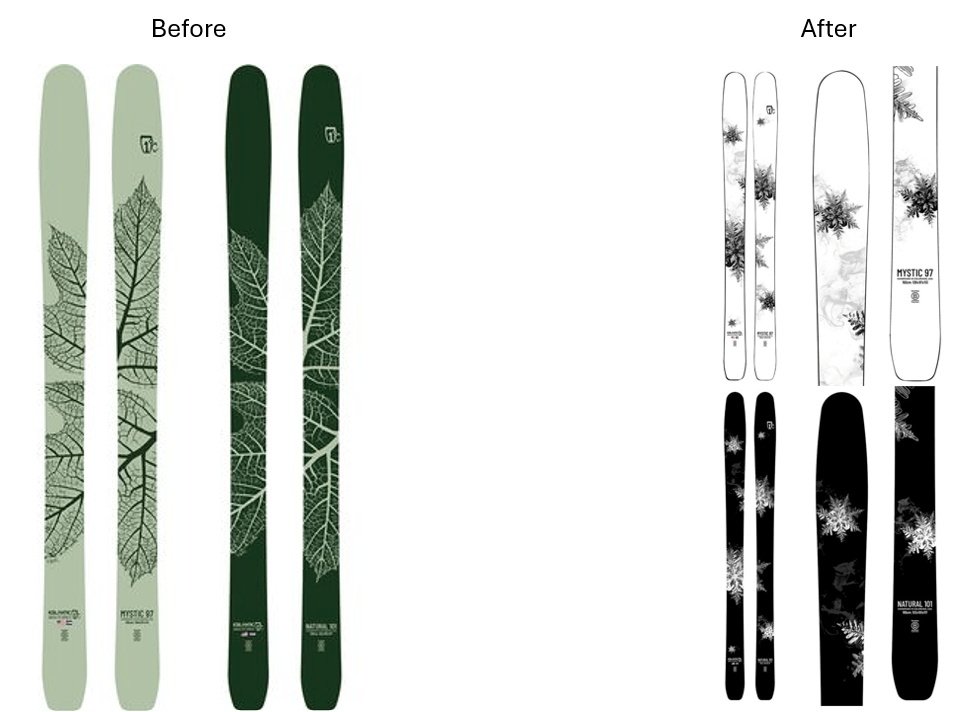 Biggest Glow Down: Icelantic Mystic and Natural saw a big decline from the top spot last year (90% approval down to 48%). The leaf graphics from last year did a lot of things right. The greens were trendy colors. It felt familiar to the “put-a-tree-on-it” nature motif that’s predictable in ski gear, but with a novel twist with a deciduous variety. The update to snowflakes felt less original. The black and white colorway called back to 2010s minimalist aesthetic.