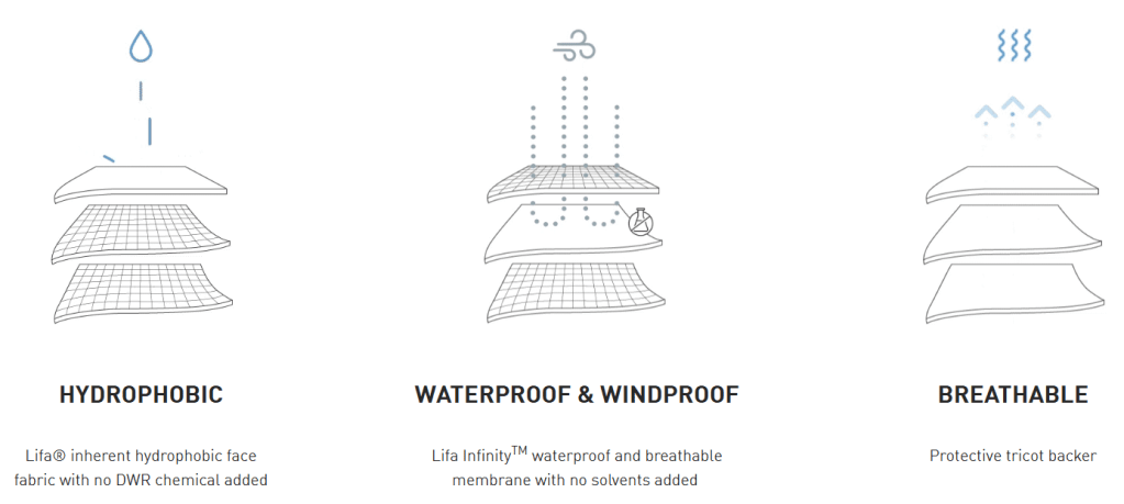 - Helly Hansen Lifa Infinity Pro – DWR Free Shells: In a time where customers were concerned about PFAS in DWR, Helly Hansen released their “Lifa Infinity Pro” shells without any DWR needed at all. The secret? Instead of the industry standard nylon or polyester, they use polypropylene. Polypropylene is inherently hydrophobic and repels water. If it does wet out, it dries faster. But if it’s so revolutionary, why are other brands opting for other fibers? Polypropylene is very susceptible to UV degradation – even with stabilizing additives (which, worth mentioning, also leech and bioaccumulate). Polypropylene is great in Helly’s synthetic and merino-blend base layers since they’re usually covered. But a $750 ski shell? Still going to be worn on bluebird days and should hopefully stand up to them. Polypropylene is also significantly cheaper (20-50% lower than polyester; 50-70% cheaper than nylon). It’s also a much weaker fiber – even before sun degradation – less abrasion resistant, and more prone to stretching and sagging. The fiber has 1 pro and a long list of cons, but Helly Hansen’s milking the former for huge profits. They use it a lot in their synthetic base layers, where it performs very well for a budget material by wicking and drying well (odor retention is its only major weakness).