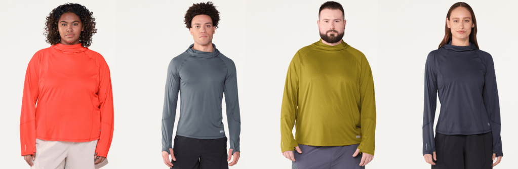 - REI Coop Flash Shade Hoodie: REI’s had a more casual Sahara Sun Hoodie in their assortment for years, and I’m so stoked they’re adding a higher performance sibling. The fabric’s 25% lighter. The hood provides more coverage. The pattern design moves with the body better (raglan sleeves, side body panels). They also manage costing well with mock flatlock seams – less bulky than the serged seams on the Sahara, but bulkier and not as strong under tension as the $100+ competitors. (I’d make sure there’s some ease in the fit). I also love that it comes in plus sizes for women and tall sizes for men.